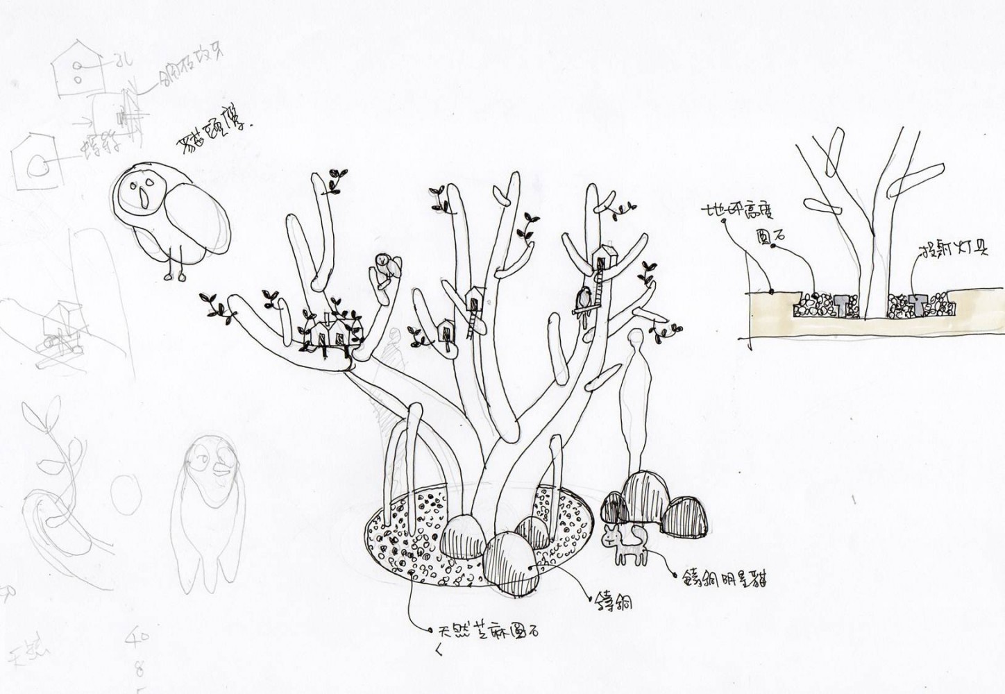 樹上梢蓋幾棟樹屋,樹下擺了一張長凳,長凳上養(yǎng)了一隻貓。 取之自然,型塑萬物,