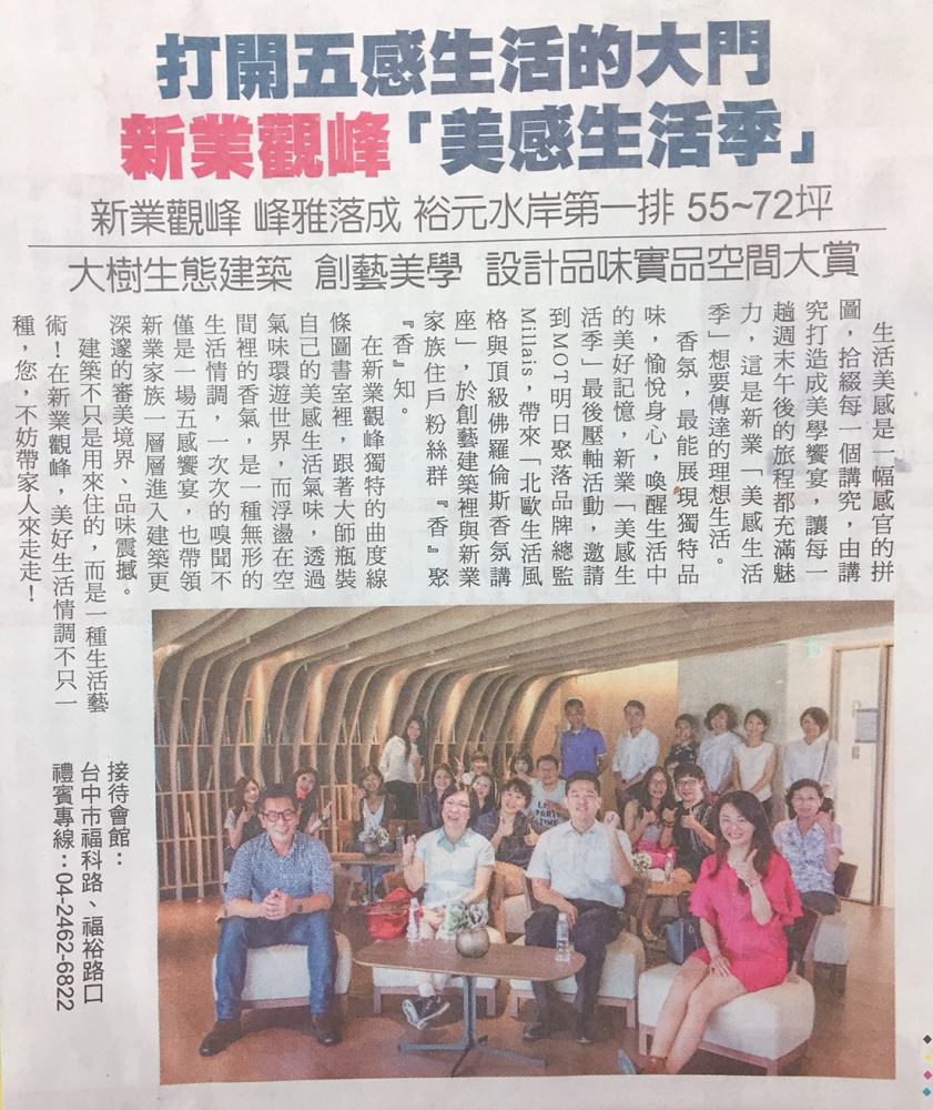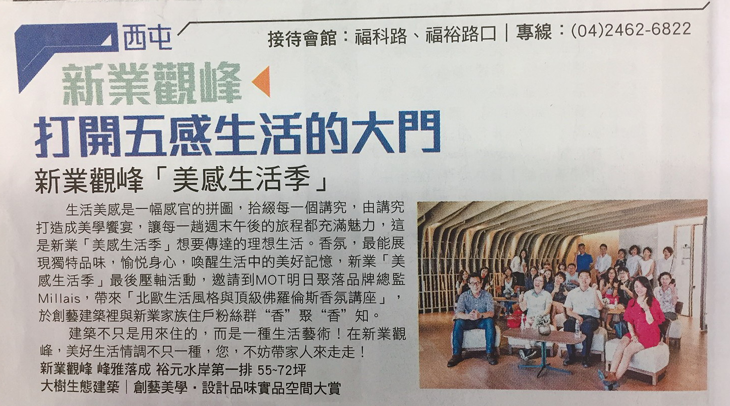 香氛,最能展現(xiàn)獨特品味,愉悅身心,喚醒生活中的美好記憶,新業(yè)「美感生活季」最後壓軸活動,邀請到MOT明日聚落品牌總監(jiān)Millais,帶來「北歐生活風格與頂級佛羅倫斯香氛講座」,於創(chuàng)藝建築裡與新業(yè)家族住戶粉絲群“香”聚“香”知。